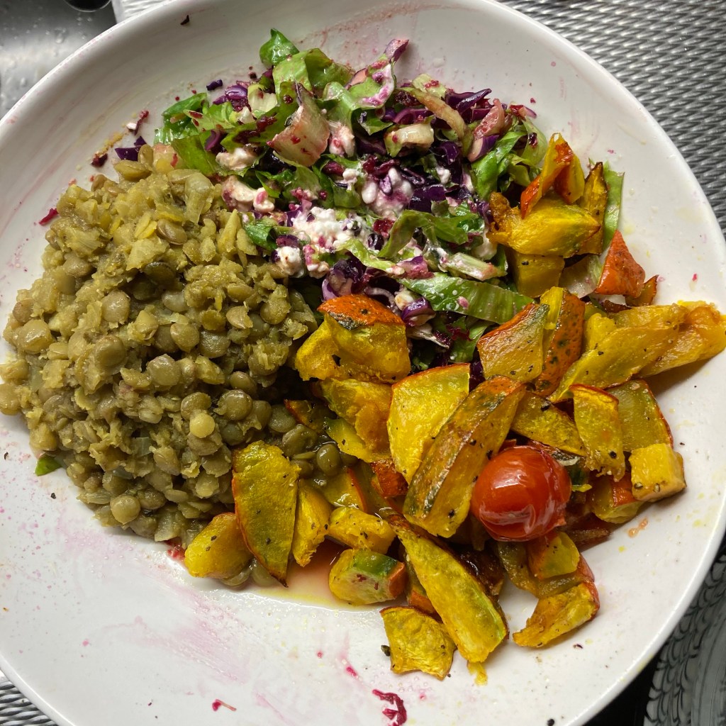 ... met dahl van gemengde linzen kort gesmoord in kokosolie en ghee, uitje, knoflook, diverse kruiden en Himalayazout en gestoofd met water. Rauwkost van verse andijvie, raapsteel en rode kool (de smaak zit in het snijden) en ‘n beetje geraspte rode biet en de jeuk wordt even vergeten.